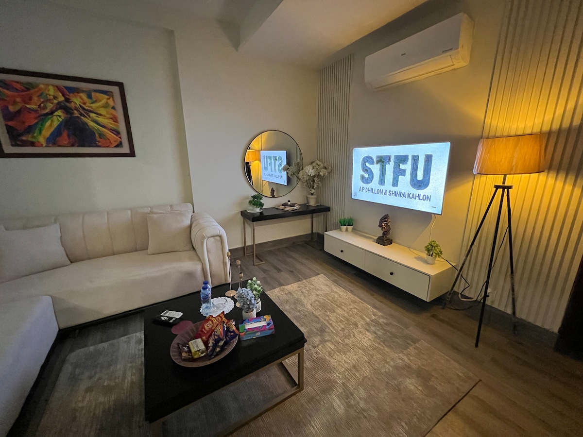Experience modern, comfort and elegance at this designer 1 bedroom apartment in Bahria Town Phase 8. Enjoy high speed WiFi, a Netflix ready Smart TV and effortless self check-in. Located in a peaceful gated community with 24/7 security. Just minutes from Giga Mall, Amazon Mall and Phase 7 Food Street. Perfect for couples, professionals or long term guests. Your serene escape in Bahria Town awaits, feel at home the moment you arrive.