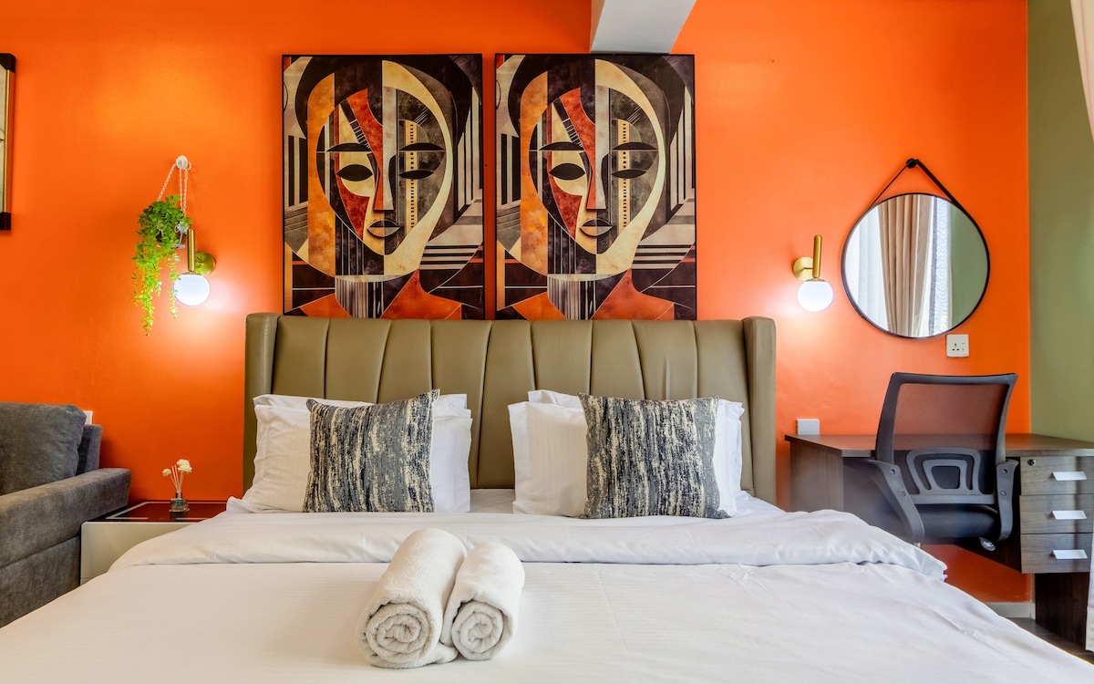 Experience soulful luxury in this Afrocentric-inspired apartment featuring bold art, warm tones, and lush plants. Enjoy a cozy bedroom, modern kitchen, and a stunning bathroom with cultural flair. Relax in the heated pool, work out in the gym, or unwind in the rooftop garden. With high-speed Wi-Fi, a pool table, and curated details, this space blends comfort, style, and culture perfectly. Book your stay and feel right at home.