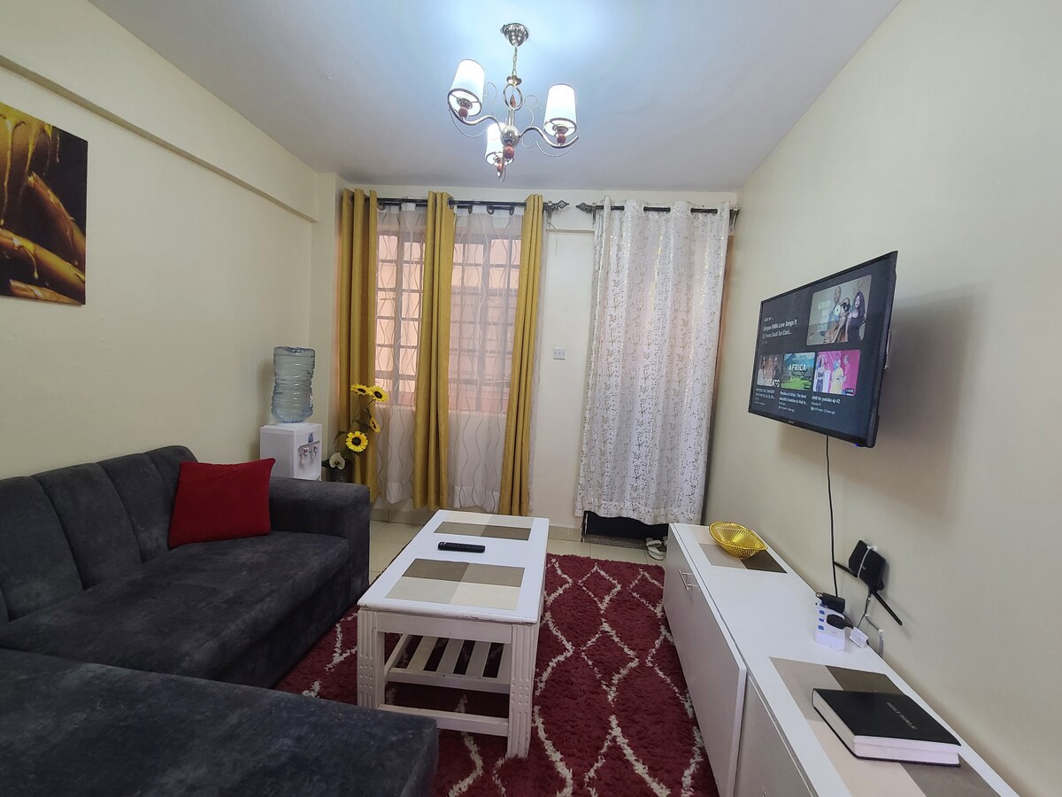 Kb ventures Home is a serene modern well furnished one bedroom which offers a homely feeling away from home. It has a fully equipped kitchen,Fresh water is available. Self check in. It’s situated about 20 minutes from the airport(depending on traffic) Nyayo estate is a gated community with 24hrs security. We have secure parking spot on the property. Shopping center is available on site. I welcome you to feel at home and make memories in this amazing apartment.