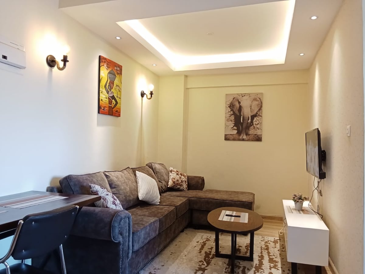 This entire stylish apartment is modern, spacious & comfortable, with one bedroom & en-suite bathroom, luxurious King size bed, eloquent dining room, bedroom & lounge Netflix-TV, balcony, kitchen and washing machine area. All amenities provided, including unlimited Fast WiFi and business facilities. Situated in a quiet leafy suburb, but also conveniently close to Westgate, Sarit and Lavington shopping malls, restaurants, business hubs, CBD and few meters walk away from Westlands nightlife.