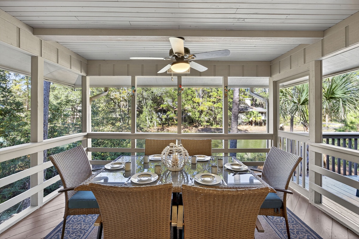 Enjoy this stylish one-bedroom, 2nd-floor villa located 100 yards from the beach on beautiful Kiawah Island. It has an 18-foot vaulted ceiling with a beautiful lagoon view from the screened porch. The bedroom offers a king-size bed, desk, walk-in closet, and a remodeled bath. The fully equipped kitchen includes a dining table for four. The villa also has a new queen-size sleeper sofa, hardwood floors throughout, a washer/dryer, and a dedicated parking space immediately in front of the building.