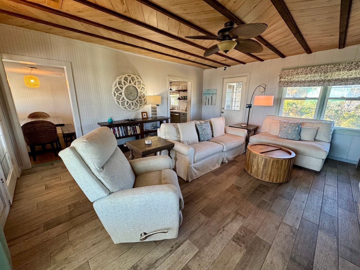 Private, cozy, newly renovated beach cottage. Enjoy ocean views. Our profile picture is the sunset view from our balcony. Fully-equipped kitchen, two dining areas, living room has a pull-out queen sofa, 55" flat screen smart tv, dvd player and free WiFi. The glass sliding door allows for beautiful ocean views & stunning sunsets over the water. Enjoy the private pier, fresh water pool & private beach access. Bedroom offers a queen size bed, sconce lights & chest of drawers. Large clothes closet.