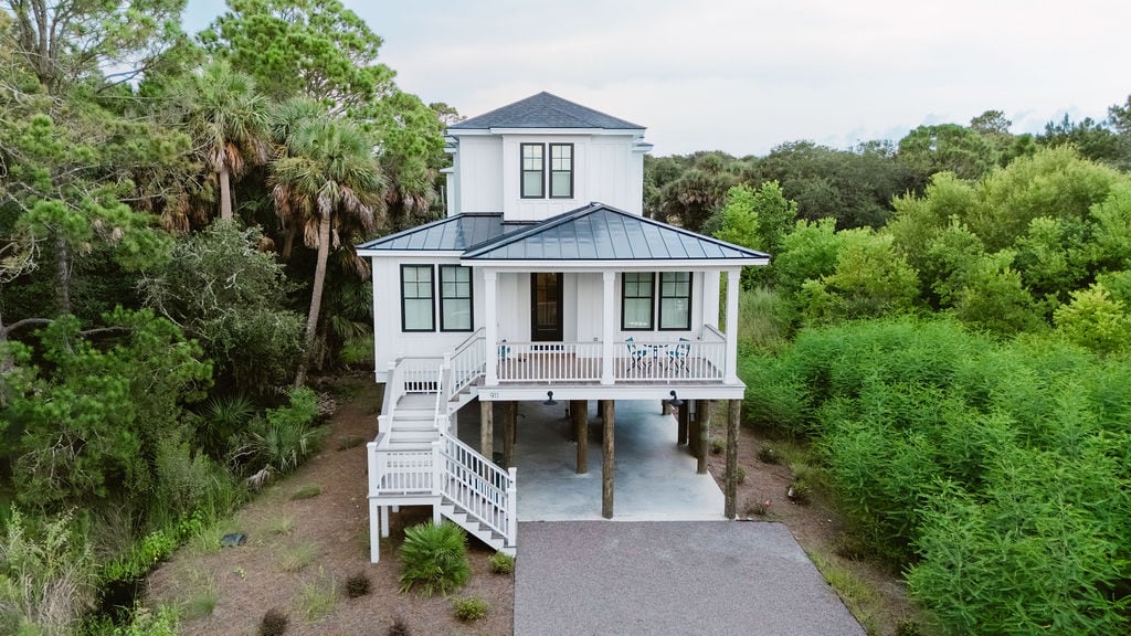 Our home offers some of the most stunning views on Folly! With four private patios, you are ablet to see amazing wildlife in the marsh, see the Intracoastal Waterway, and the Morris Lighthouse. With two king beds, two queen beds, and a bunkbed. Enjoy the hot tub overlooking the marsh, a secluded rooftop room with deck with panoramic views a Golf hitting bay and plenty for kids. This spacious house is full of character, complete with hammocks and outdoor chairs. STR23-0364799CF LIC 20072