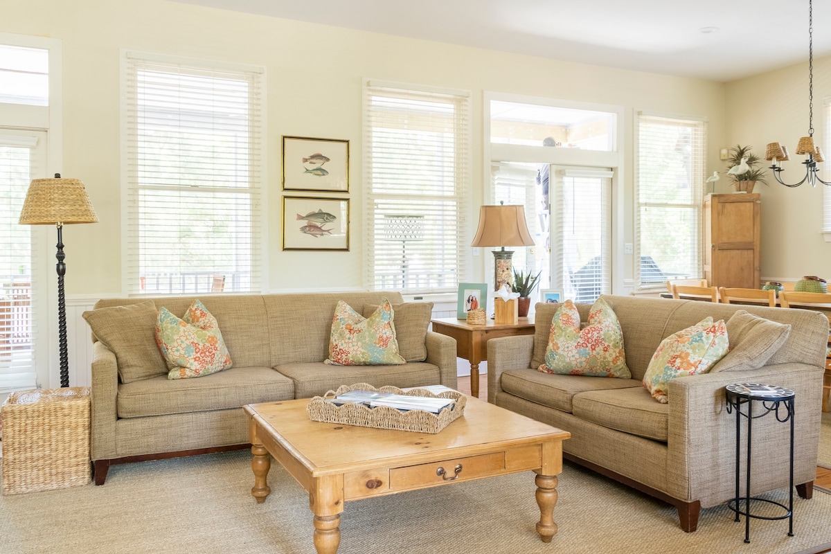 Channel the pursuit of pause in this tranquil resort-style retreat. The home boasts neutral tones, wood finishes, contrasting patterns, touches of lively green plants throughout, eclectic furnishings, and access to a shared outdoor pool and community dock. Watch the wildlife of the marsh from the screened porch or relax on the dock with a glass of wine as the sun sets. Guests have access to the Island, beaches, shops and restaurants. STR25-000066; BL25-0000680; Max 4 guests; Max cars 2.