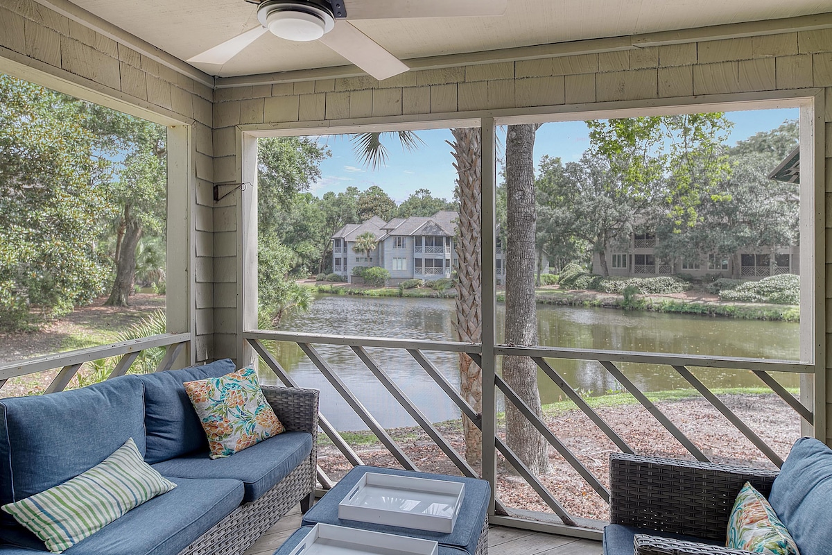 This is the beach villa you have been searching for! Lazy Lagoon is a newly renovated, beautifully furnished, Turtle Cove villa with soothing lagoon views, a coastal-themed decor and a terrific screened porch. This one bedroom, dog-friendly, second floor villa is an easy 15 minute walk to Kiawah Island's 10-mile long Atlantic Ocean beach.