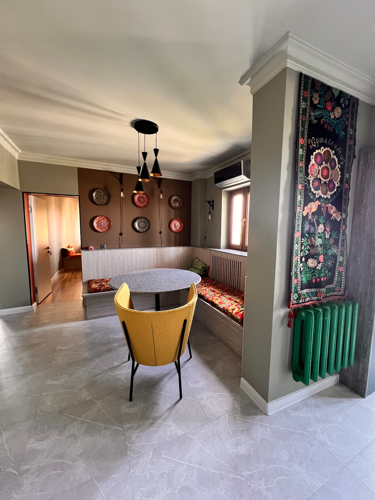 Beautiful modern renovated Canadian style unit. Comes with: - 90’ TV amazing for movie theatre experience - Full Sonos sound for amazing time while watching movie - Massive kitchen to cook - Location is 2 min away where president of Uzbekistan lives, means its a good and secure area - Down side is - its 20 min away from downtown/centre of the city - Has security camera outside of the Unit - Taxi really cheap in this area and easy to find by using Local Taxi Application on your phone