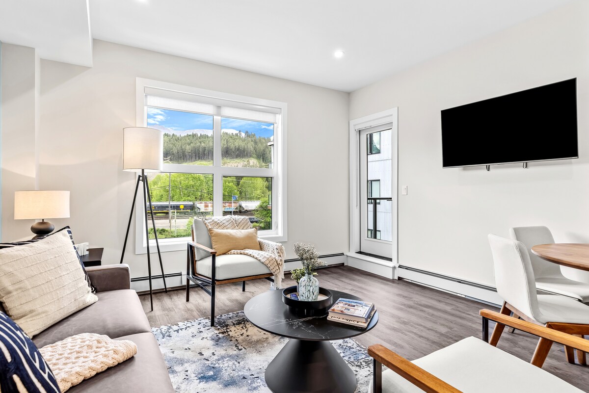 This brand new two bedroom condo is flooded with natural light, has outstanding mountain views and overlooks the river. Contemporary open floor plan, an artistic and cozy place that sleeps up to 4 and is ideal for couples or a family. Centrally located downtown, you are just steps away from your favourite cafes, shops and restaurants. You are minutes away from the ski hill and Moonraker/CBT bike trails, and right on the river pathway. Provincial Registration # H391623453