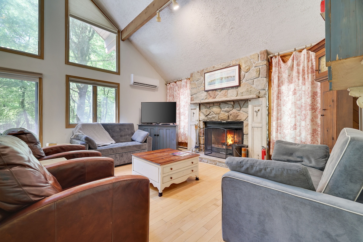 Nestled among trees and boulders, this chalet-style home offers serene, natural beauty and comfort during your stay in the Poconos. An all-season destination, guests can enjoy close proximity to ski slopes in winter, hiking in the spring, boating in the summer, and vibrant fall foliage. The house boasts large windows and a cozy living room with a large stone fireplace. Large bedrooms, plus a den easily accommodate a crowd.