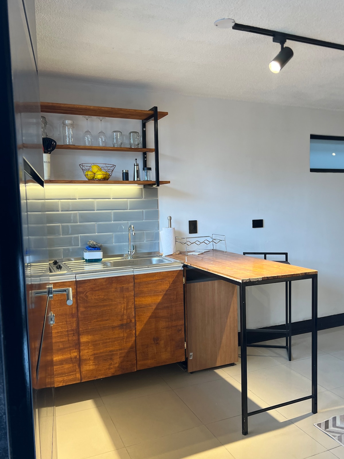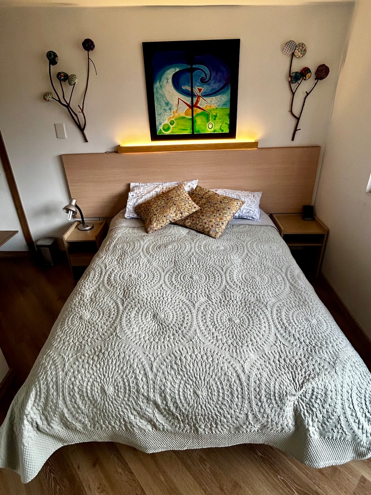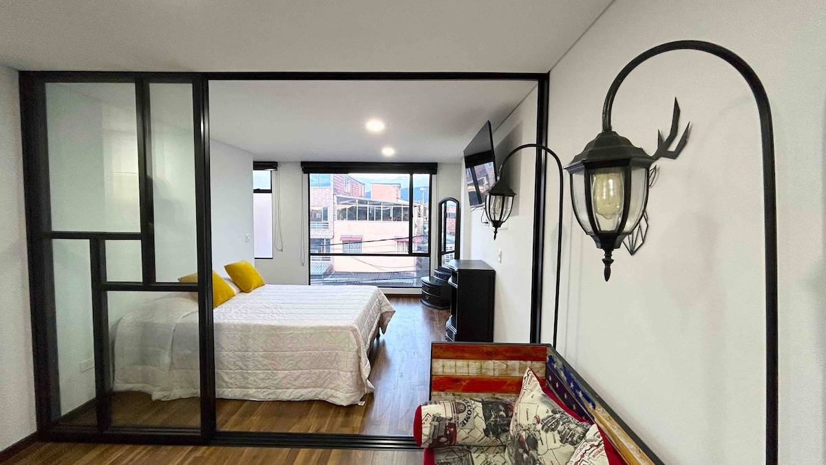 Our comfortable one bedroom apart-studio, interior location with windows towards a garage, and to a courtyard, bohemian, minimalist, with a small garden has a true city feeling! It comfortably accommodates four people and it´s centrally located on a street, with easy access to Simon Bolivar Metropolitan Park. Enjoy a complete kitchen, and access to Transmilenio. This space is ideal for two people; however, we provide a high quality sofa bed for two more people should the need arise. Hot water