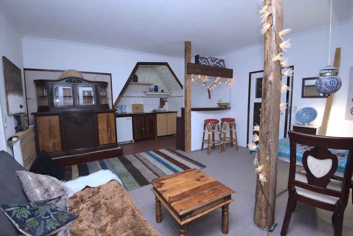 Bright maisonette attic flat on 3 floors, with sunny roof terrace directly on the Kiel Fjord. The modern and fully equipped flat extends over three floors and has two living rooms, a cosy bedroom on the top floor, two bathrooms and a large roof terrace. A total of 6 beds are available, two on each floor.