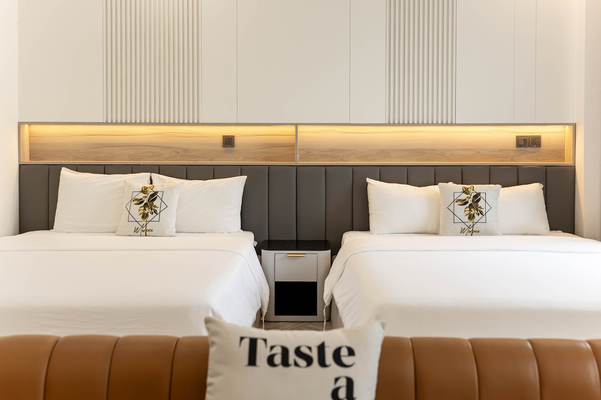 Enjoy a comfortable stay in our Quadruple Room at Varia Hotel-perfect for families or groups of up to four. The room features two queen beds, cozy modern décor, air conditioning, free Wi-Fi, a flat-screen TV, minibar, and a private bathroom stocked with fresh towels and toiletries. A large window offers lovely views of the city, adding to the relaxing atmosphere. Located just steps from Dinh Cau Beach and the vibrant night market, it's the ideal base to unwind and explore the best of Phu Quoc.