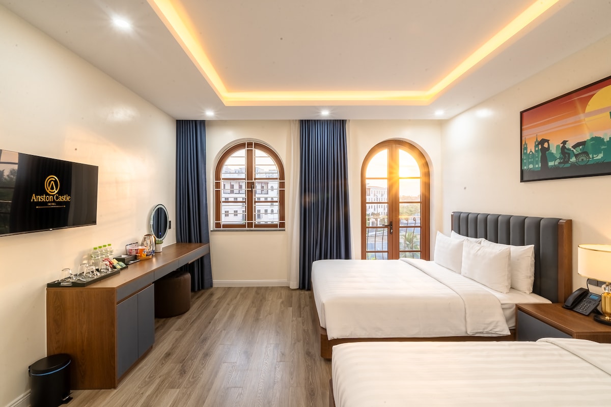 Anston Castle Hotel tại thị trấn Hoàng Hôn sẽ mang đến cho bạn một kì nghĩ tuyệt vời. Nằm ngay vị trí trung tâm phía Nam đảo Phú Quốc thuận tiện di chuyển đến các điểm du lịch nổi tiếng như: cáp treo hòn Thơm, Cầu hôn, Chợ đêm Vuifest, Bãi khem, Bãi sao..... Từ sân thượng khách sạn có thể ngắm pháo hoa hằng đêm. Diện tích phòng từ 28 mét vuông, giường rộng 1,6m sẽ mang đến cho bạn kì nghĩ tuyệt vời.