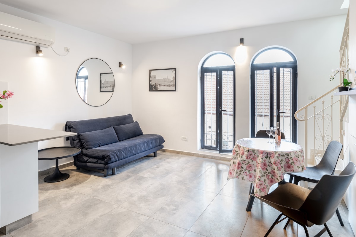 Bright 50sqm duplex in Jerusalem's charming Nachlaot, steps from Machaneh Yehuda Market. This modern, Shabbat-friendly apartment comfortably sleeps 5 and features a private sunny balcony, a fully equipped kosher kitchen, and A/C. Perfect for families or groups exploring the heart of the city, with easy access to public transport.