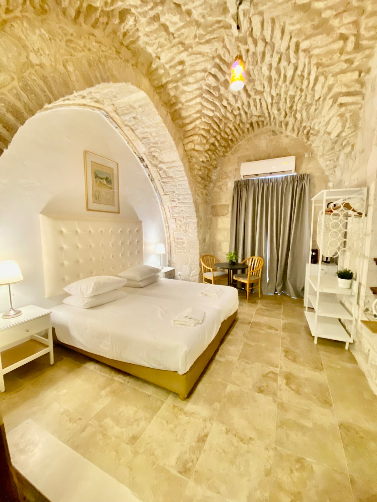 Experience Jerusalem from a serene, refreshing home base. Charming 30 sq m apartment in the heart of Ein Kerem, the most delightful neighborhood of Jerusalem with nice cafes, surrounded by lush nature and ancient terraces. Softly renovated, the bedroom provides an elegant arched ceiling dating back to the 1890s. Jerusalem Stone walls lend a unique ambiance. Private roof top with stunning views of the St John´s Church. Ideal for a couple and an infant, with a warm and welcoming host family