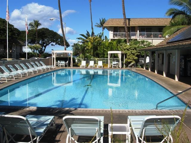 Studio w/private bath, kitchenette in the Kihei Kai Nani complex with new split air conditioner. You are walking distance to numerous restaurants and shops and across from Kamaole II Beach, one of the best beaches on Maui! Free easy parking; coin operated laundry on premises. Private lanai with pool view. No resort fees. The studio is on the 3rd floor walk up! (no elevator) The property is non-smoking except for 2 designated areas. *Nightly rate INCLUDES mandatory taxes.