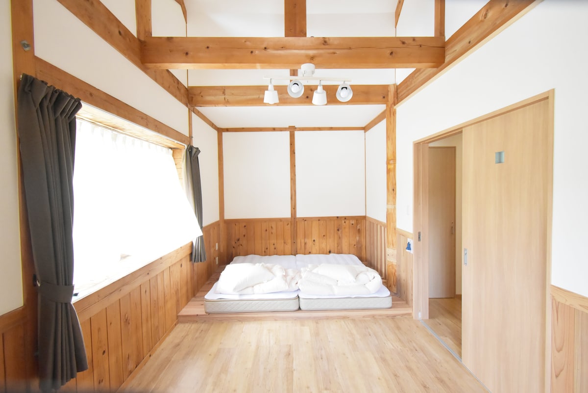 1軒家1組のみの貸切です(料金は人数により加算されます)。 16畳(8畳2間)のリビングルーム兼寝室と6畳寝室の2室で最大8名宿泊できます。 風呂、トイレ、洗濯機、キッチン、冷蔵庫を完備しています。フェイスタオル、バスタオル付。 無料Wi-Fiです。 部屋は2階にあり、隣家に音が聞こえにくいので小さなお子さんがいる家族や静かに過ごしたい方にぴったりの家です。 家の周辺は交通量や歩行者が少なく静かに過ごせます。