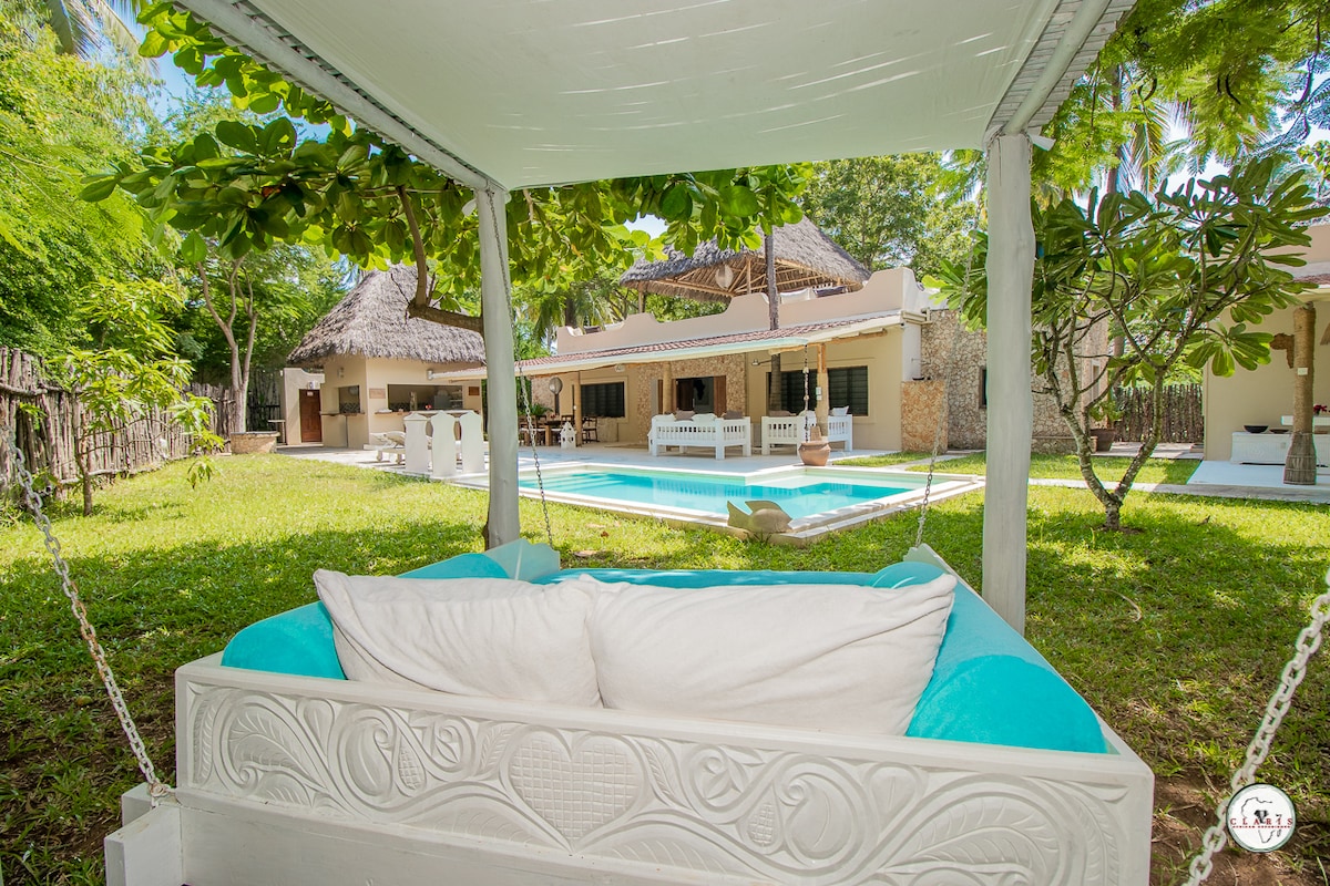 Welcome to your own private tropical paradise in Malindi! Relax in this stunning 5-bedroom villa featuring an open-air living area and a private, refreshing pool. This serene, secluded retreat is perfect for a luxurious getaway. Our 2-person staff is onsite at all times to ensure your stay is seamless and convenient! Enjoy complimentary laundry! *5 bedrooms (each with an ensuite bathroom & AC) *Dedicated workspaces and Wifi *Sun loungers *Massage, and an onsite chef for additional fee! *Pool