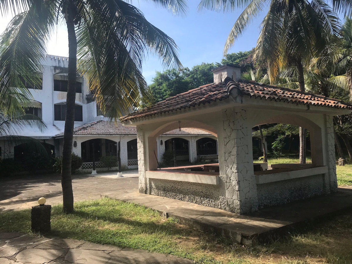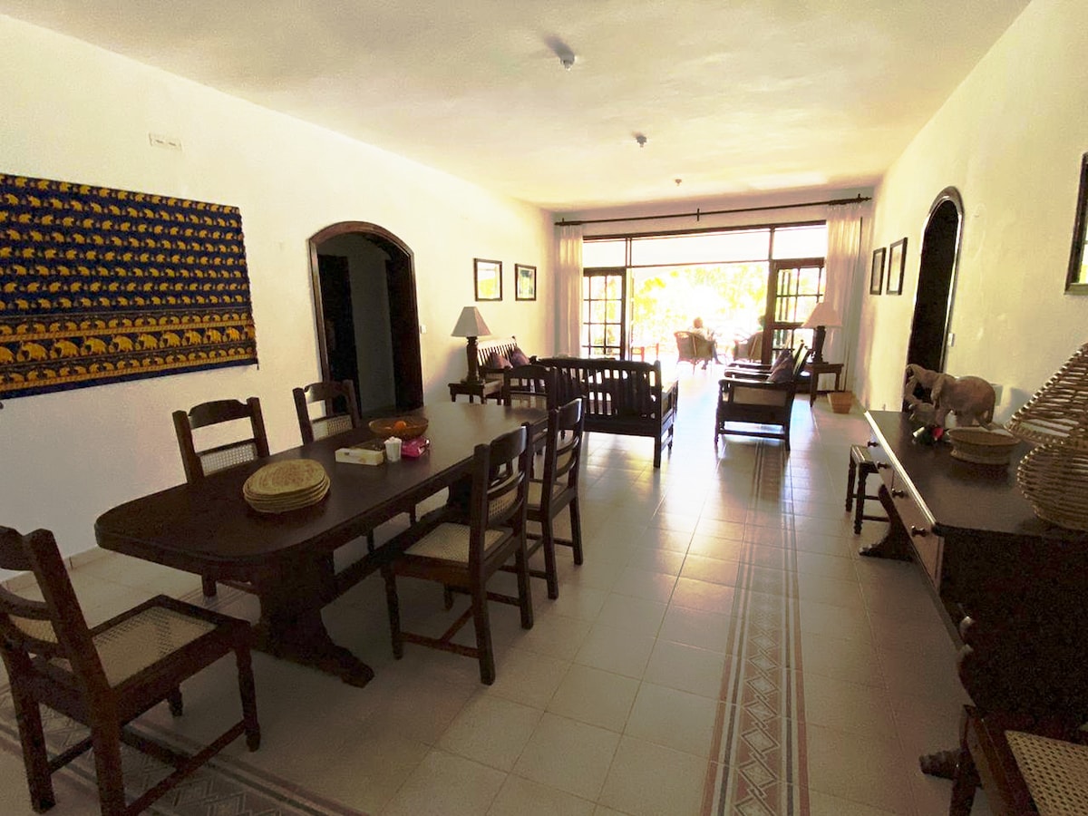 Traditional Swahili style house, stands on coral headland overlooking sea, beach, beautiful flowering gardens, private access to beach. Swimming pool recently installed, SEE HOUSE RULES Villa has 2 levels & views of Indian Ocean, private direct access to the beach, which stretches out either side, within the Marine Park. Includes 3 staff, cook, and daily room service, and gardener. Sleeps up to 10. Easily adapted and made comfortable to host smaller groups, by using just the upstairs bedrooms.