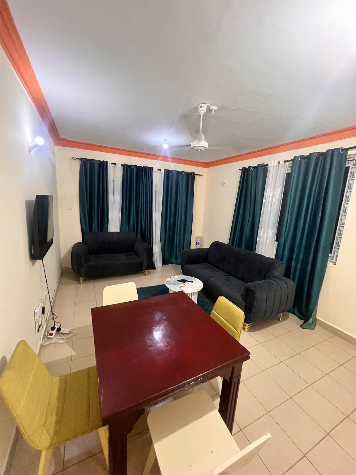 A cozy serviced studio apartment (Bamburi) furnished *Suitable for 2 adults and 1 child or 3 adults, furnished with a queen size bed and a single bed *Daily cleaning included *Dining table with four chairs, sofa, coffee table *AC *TV *Lock up safe *Balcony-two chairs, coffee table *Kitchen - fridge, microwave, kettle, coffee maker, toaster, crockery, cutlery *Access to amenities - pool, kids play area, beach bar, restaurant, gym, beach, laundry *21 km from Moi Int airport *26km from SGR Mombasa