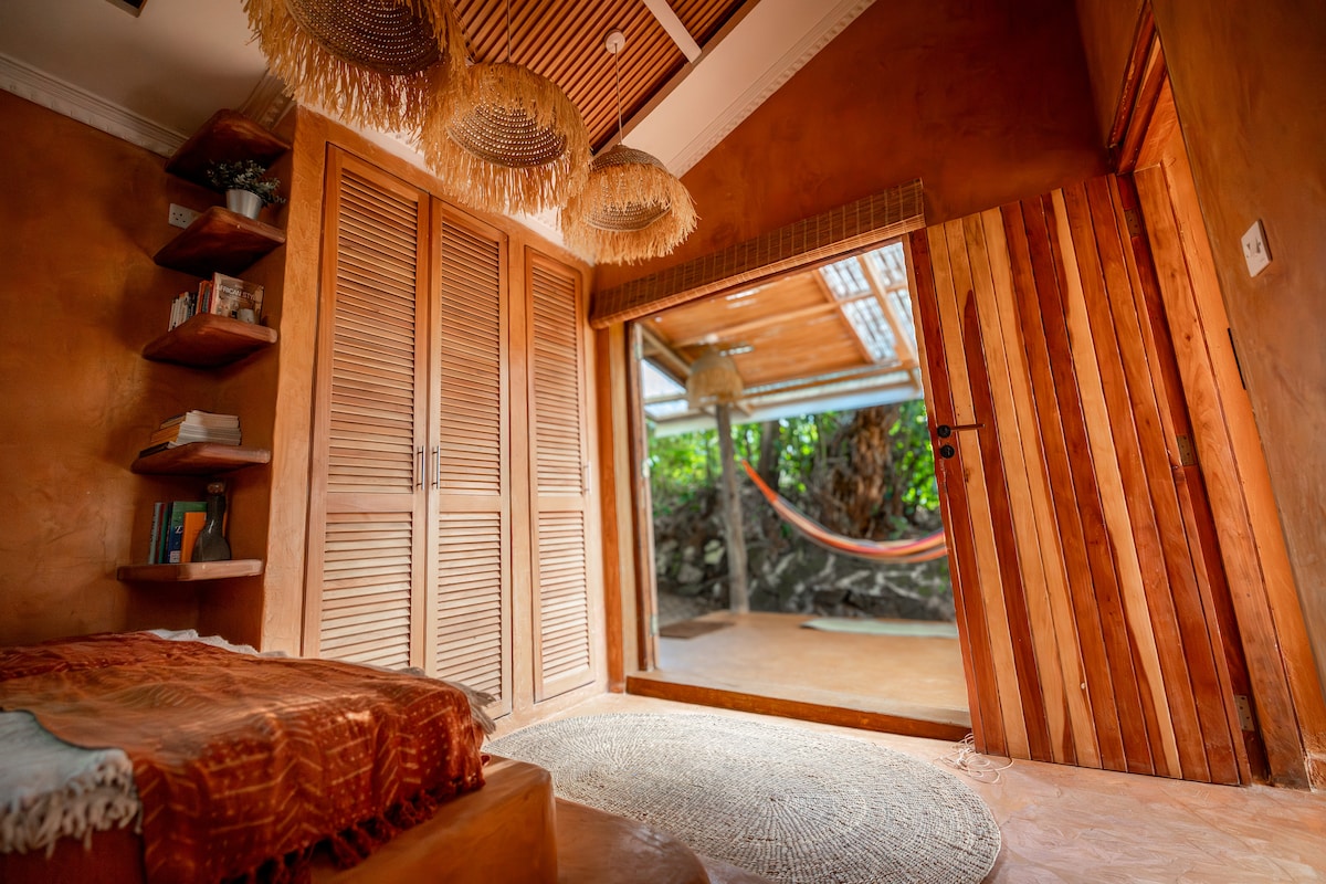 A comfortable and stylish one bedroomed cottage with contemporary accessories. The kitchen is stocked with all the essentials. The bedroom features a king size Zanzibari bed with a framed and spacious mosquito net and firm mattress. A modern bathroom with solar heated water and always lovely bath products and fresh towels. Fast internet and TV with Netflix. A private verandah with a secluded secret garden under the statuesque Bombax trees. Plenty of privacy.