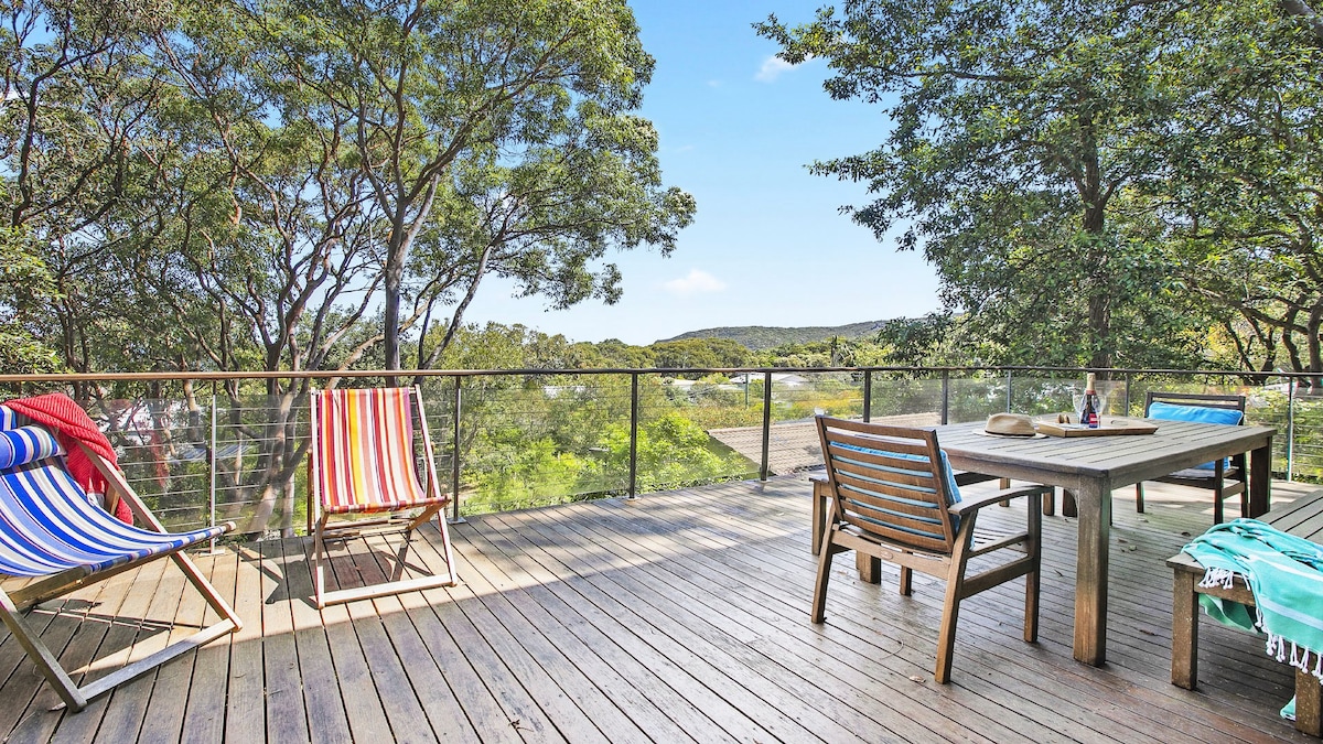 Bathed in natural light this seperate spacious private cottage with its own entrance offers a stylish tranquil vibe overlooking the treetops to the water. Wake up to the chorus of birdsong in the super comfortable king sized bed. Large balcony with modern gas BBQ and two chairs. A perfect retreat to watch an amazing sunset and unwind. Take a hike through spectacular walking trails in the national park or visit pristine surf beaches which are all on our door step within walking distance. Bliss!