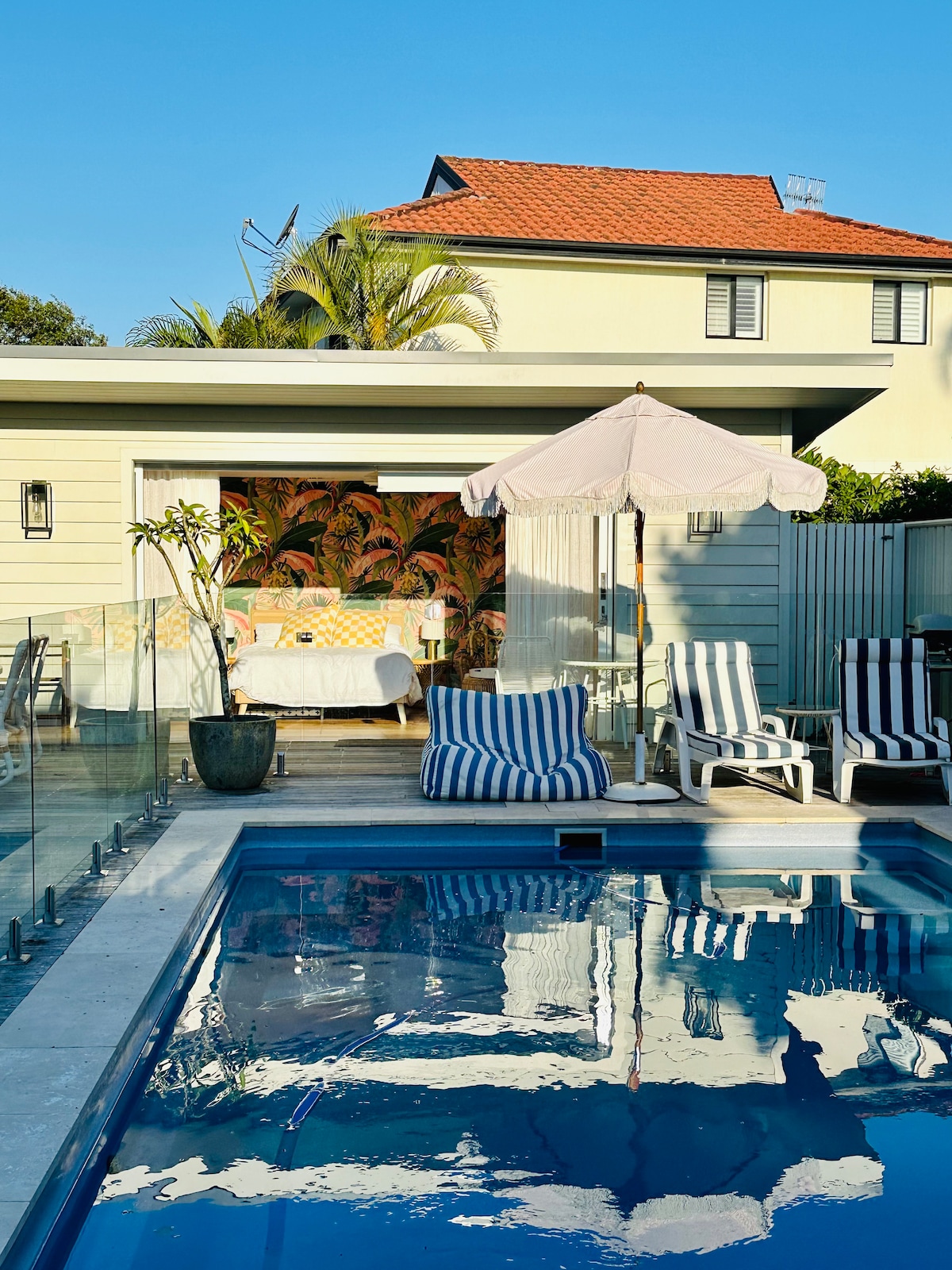 Guests are warmly welcomed to our modern pool house which is located behind our home with private access from the side. We’re a happy family who understand the need for privacy while on your getaway & will not intrude. The pool & garden is shared with us but we are often out and about. - In addition out of respect we will not use it early or late night. Full kitchen and BBQ. Blockout blinds &privacy curtains. All furniture and linen new and hotel quality. Toddler/baby friendly