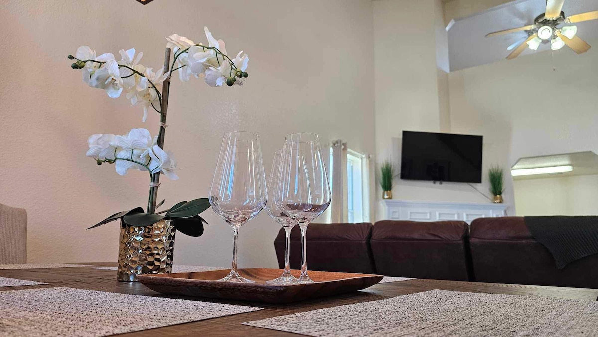 Mediterranean Style Home in community w/Country backyard view. Close to Fort Hood/Shopping. Complimentary bottle of wine! Office Space. King Master Bed, Walk Through Shower/Soaking Tub (No Whirlpool Jets). 2 Queen sized beds. 3 TVs w/Roku for streaming. Keurig (K-Cups provided),Full Size Refrigerator AND Mini Fridge, 2 patio w/seating, Gas Grill (1 time 15.00 fee to use). Electric LR Fireplace. WIFI. NO PETS. Exterior lighting/outside cameras on the property for safety. Treadmill upon request.