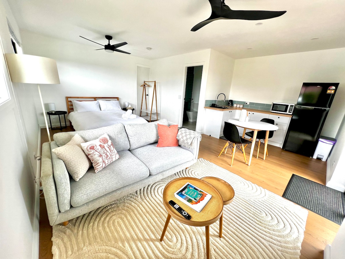 From the moment you step through the gate, you feel the relaxed Byron vibe! It's a 2 min walk to Baz & Shaz's 'pantry', 7 mins to Suffolk village, and 15 mins to Tallow Beach. The centre of bustling Byron is a 10 min drive. The Suite has a king-sized dbl bed, ensuite, private entry, private verandah and courtyard with table and chairs, and a desk in a nook. There's a kitchen cupboard with a microwave, bar fridge, toaster, kettle and crockery suitable for breakfasts and managing takeaway.
