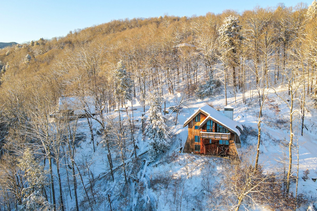 山景度假木屋,配备热水浴缸和火坑!