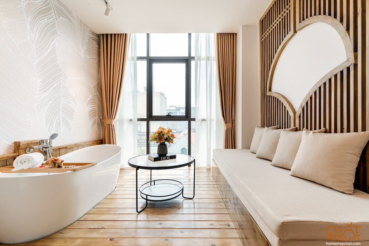 明亮的河内单间公寓|浸泡式浴缸•城市景观