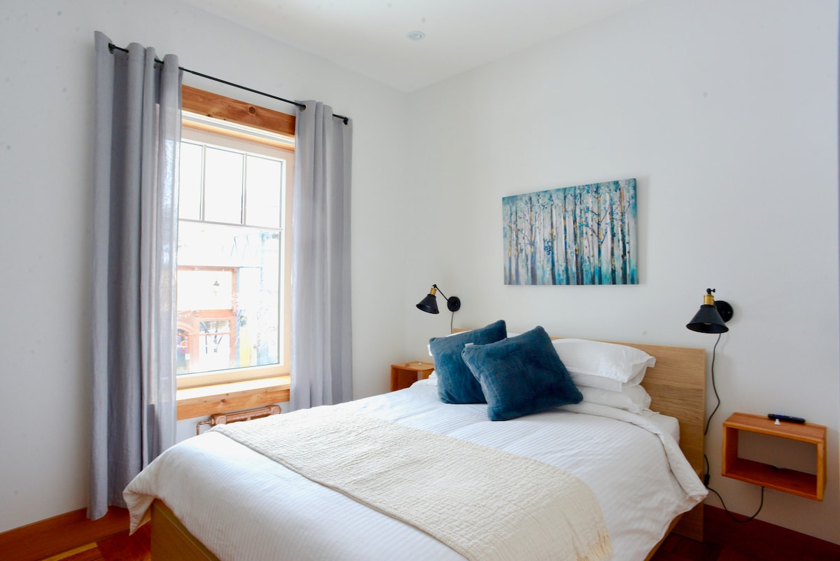Discover our Kimberley gem, nestled in Platzl's heart. Tall ceilings and abundant natural light. Immerse yourself in Kimberley's vibrant culture with restaurants and shops just steps away. Stay connected with high-speed internet and enjoy our Roku TVs. Despite the hustle and bustle of the Platzl, our triple-pane windows ensure peace. There are 22 stairs leading to the apartment, adding a touch of character to your historic experience. Free parking 30 meters away.