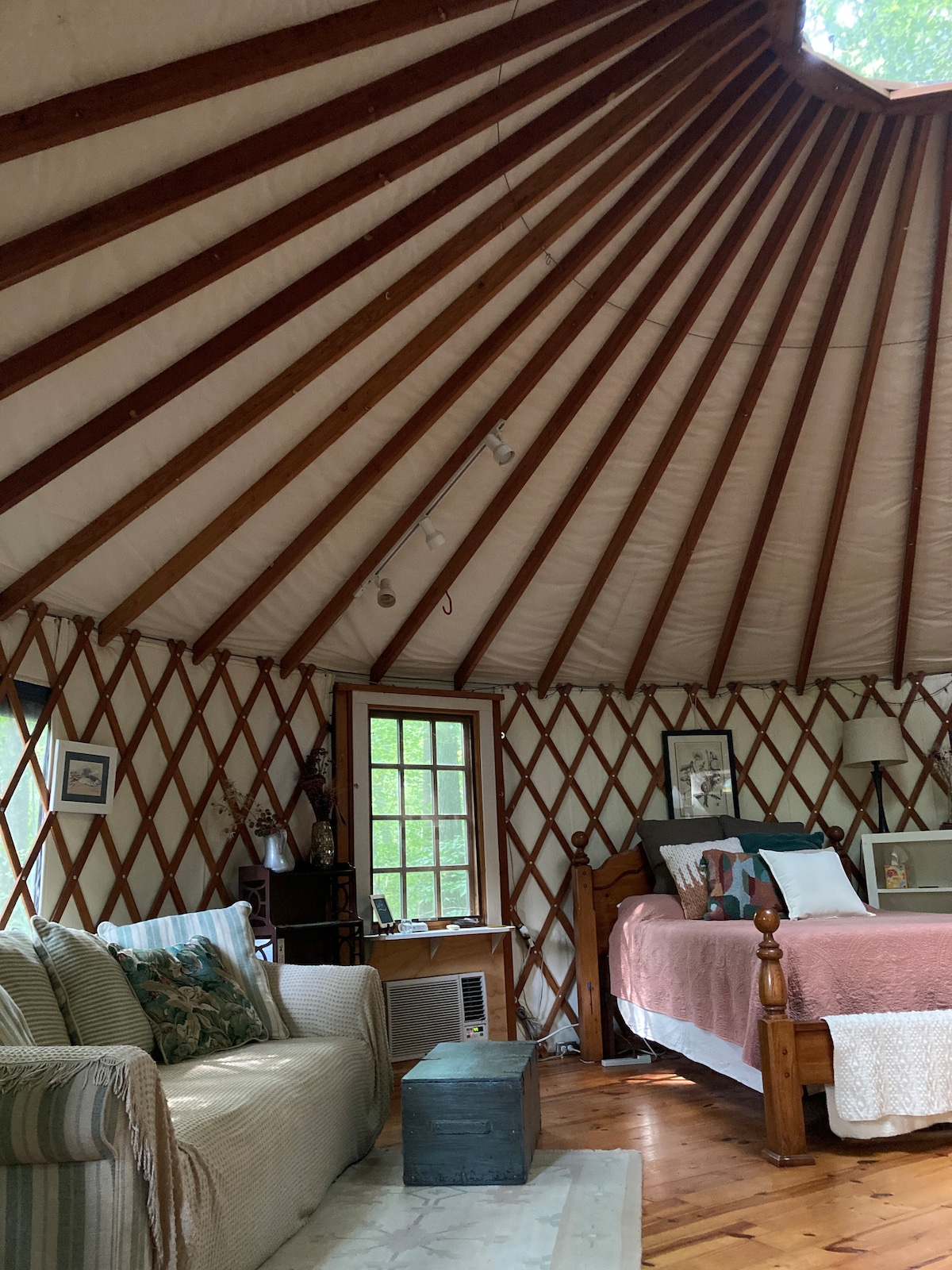 Our yurt (30' dia.) is rustic, beautiful, quiet, in deep woods with deck overlooking pond. Great for couples, small families (not childproof). Includes hot tub & Poetry Walk. Beds are futons. It's warm June-Aug. (no A/C, plenty fans), but way cooler than the city. It's cold Nov.-March (wood stove heat). Mini-fridge & microwave (no kitchen/plumbing). Parking and the bath-house are 2-min. walks (toilet, sink, shower). Two minutes to Saxapahaw. Read description for more info. NO PARTIES. No dogs.