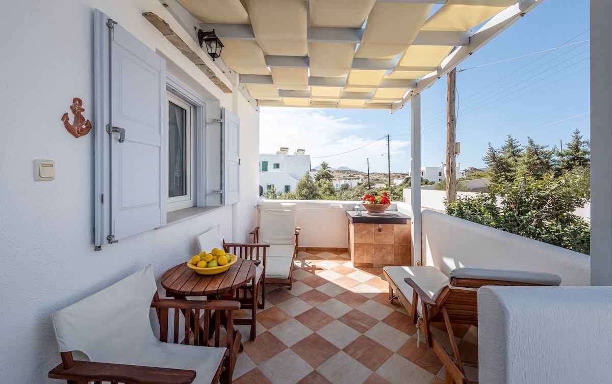 "Casa de flores" was renovated, bloomed and is ready to host you "Casa de flores" is composed of one appartment (45sqm) in an area of 500sqm with a back yard, a 50sqm deck with veranda, barbeque & garden with flowers. The appartment has one bedroom, a fully-equiped kitchen with dining table and a living room with sofa that converts into bed. "Casa de flores" will offer you comfortable & unforgettable vacation in our beautiful island, Milos.