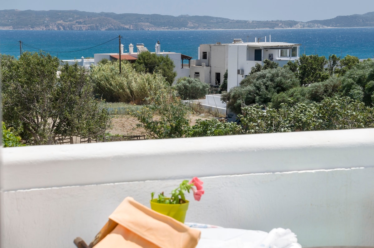Private, high-ceilinged farmhouse apartment with bedroom and bathroom. Special kitchen corner, preparation of breakfast & cold dishes. 2 balconies (40m2 in total), with a panoramic view of the port in front and the sea of Sarakiniko behind (the lunar landscape is only 15 minutes away on foot). Distances: 4 minutes from the port and 7 from the airport by car, Plaka: 5km, Pollonia: 7km, Fyriplaka-Tsigrado in 15 minutes. Recently landscaped garden, natural environment with privacy & tranquility