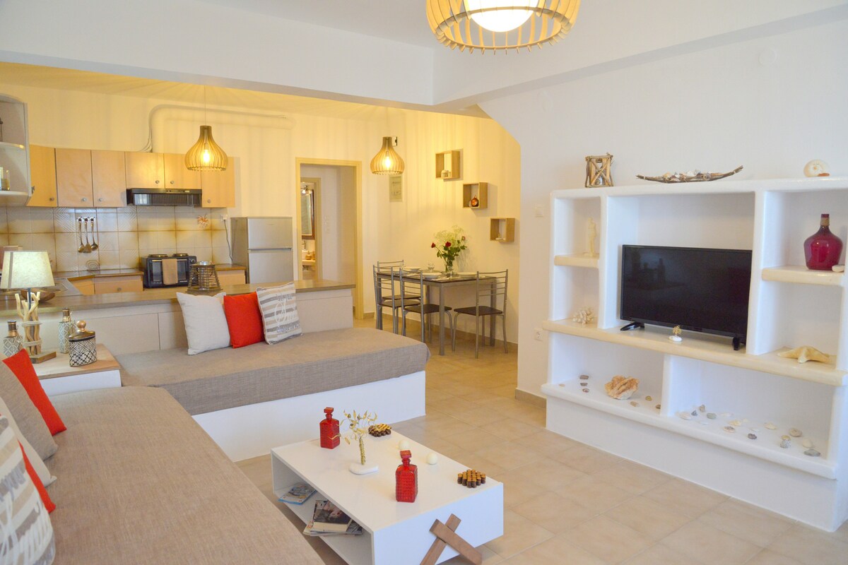Villa Tasoula it's located 1km from Adamas downtown ,built with Cycladic architecture it is separated in two floors. Upstairs live my family,at the first floor we made 4 places for hosting. Two apartments and two studio. The Sunrise apartment 45 sq.m. fully equipped available for 3 person.there is not sea view but it is 150 meters from the beach of papikinou, ιdeal for relaxing and pleasant holidays !