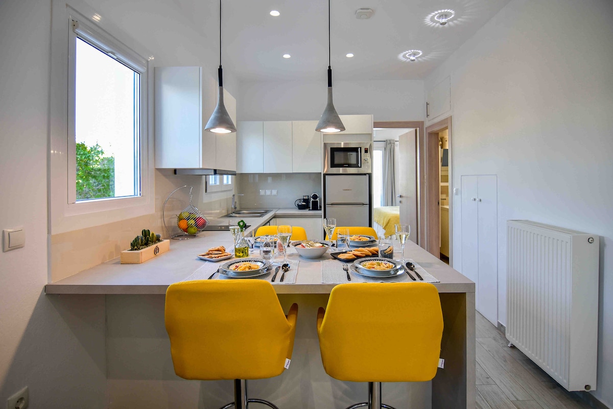 The Green Suite is a big apartment of 75 square meters for 6 people. It is a boutique suite with a regular kitchen, 2 bathrooms, 1 double room with 1 double bed, an attic with 1 double bed, a living room with 2 single sofa beds and an amazing view. It’s a fantastic apartment for a family, equipped with everything you need for cooking, a fridge, an oven and a dish washer. The Green Suite belongs to the Captain Zeppos Boutique Suites and Villa complex on the waterfront of the village Pollonia.