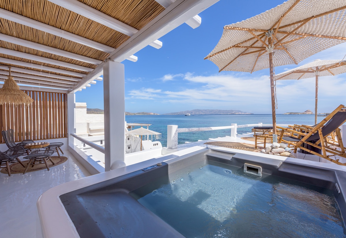 “Villa Soleil” is a beautiful Cycladic House, with a stunning sea view from each point of the house, comfy and functional, ideal for a family or a big party vacation. If you are looking for a peaceful getaway, the space and the view will totally reward you! Our garden is full of local plants, flowers and herbs and features a large sea view jacuzzi that will also add to your moments of relaxation watching the sea just in front of you!