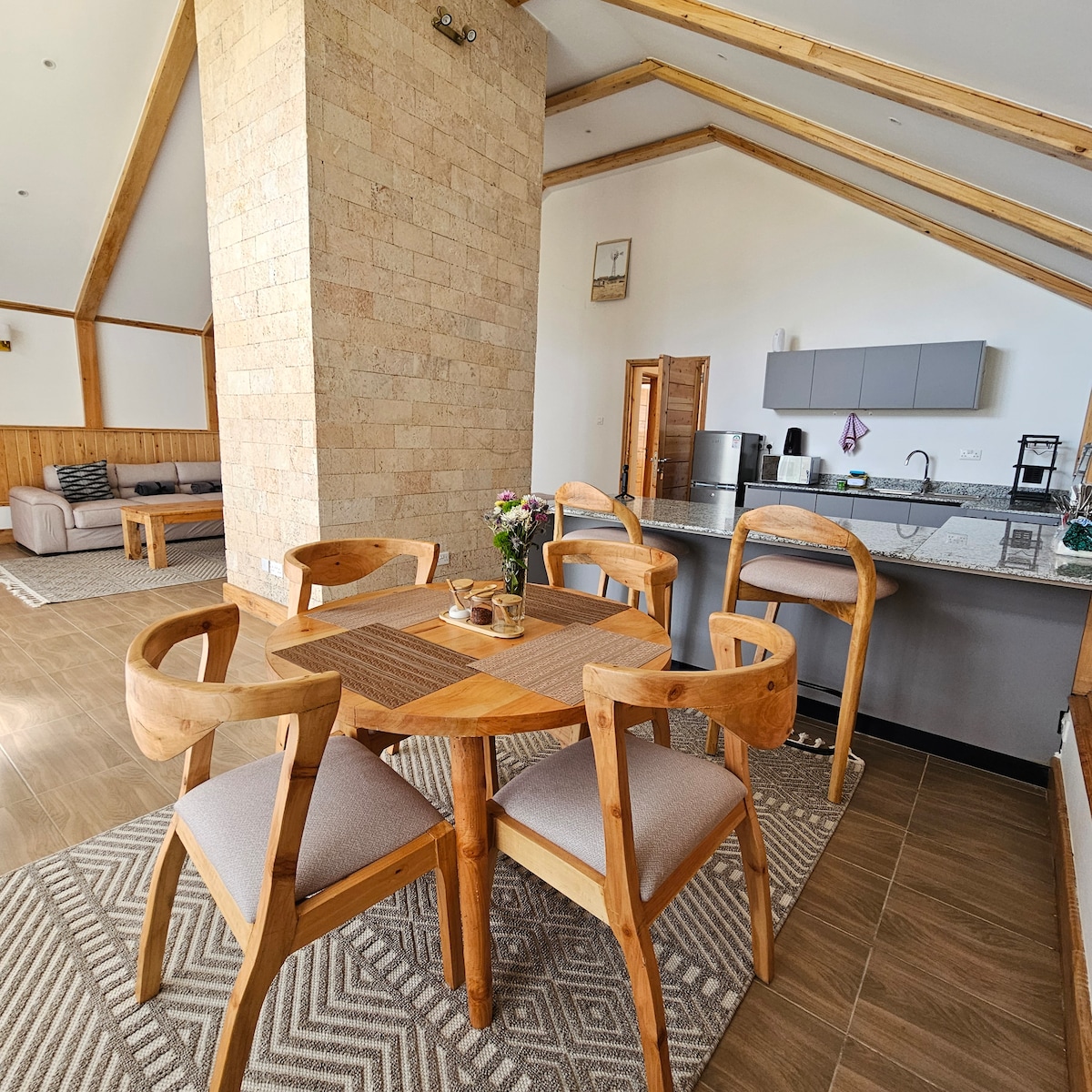 Welcome to the Penthouse Suite at Idan Barn, a warm, inviting hideaway perched on the top floor of our rustic-modern barn. This self-catering suite offers a private bedroom, lounge area, dining space, and a fully equipped kitchen — all opening to a large balcony with mountain & country views. Relax with a movie on the TV, enjoy our board games, or unwind on the balcony as you watch the sun rise over Mt Kenya. Guests have full access to our on-site café, ideal for freshly made meals and drinks.