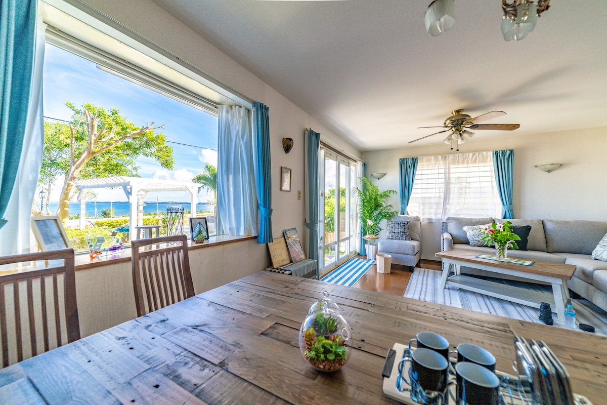 340度オーシャンビューの崖の上に立つ2022年9月新築の一軒家。 約100平米のすべての部屋がオーシャンビュー。お客様の使用可能エリアは2階の宿泊施設と、3階屋上のバーベキューテラスです。 各部屋に50インチ以上のテレビ、リビングには4Kプロジェクターと大型のスクリーンがあり、映画鑑賞も可能です。 外階段からつながる屋上にはバーベキューテラスがあり、サンライズも、日中のオーシャンビューも、夕方のサンライズも、夜の夜景と星空、月も楽しめます。海や自然の景色に癒されます。 屋上テラスにはトイレが完備されており、キッチンスペース、洗い場もございます。コンセントは8つ有り、IHを使った調理なども可能です。 2つある寝室には、ダブルベッドが2つずつ用意されており、最大8名様の宿泊が可能。 リビングにあるソファーにもシングルベッドサイズのスペース有り。 カップルでも、ご夫婦でも、ご家族でも、3世代のご旅行でもお勧めです。 周りはとても静かで、夜は虫の音色、フクロウの声、耳を澄ませば波の音なども聞こえてきます。 車で10分の場所に海中道路などがあり、マリンスポーツの拠点としてもお勧めです。