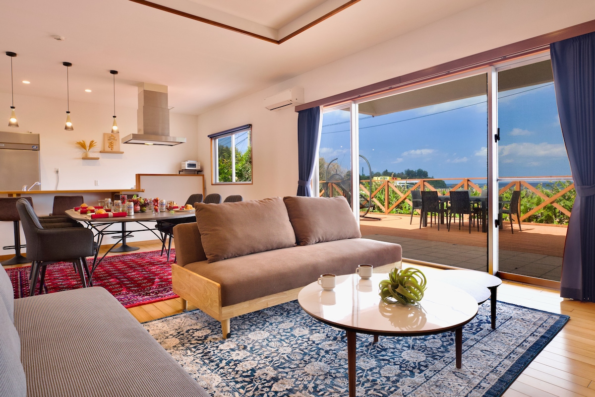 那覇空港から車で約30分。 奥武島を見下ろす静かな住宅街に佇む平屋建ての一軒家。広々テラスで海を眺めながらのんびりくつろいで下さい。満天の星空を眺めながら入るジャグジーも最高ですよ。 出張アロママッサージもテラスで受けられますので日々の疲れを癒やしてください。 お庭でBBQも出来ます。[夜9時まで。BBQ用具貸し出し可(コンロ、炭、網等一式1000円)要事前予約] 興味があれば三線の貸し出しや極簡単なレクチャーもいたします! また、ホストの自宅が隣接しているのできめ細かいサービスを心がけています。 ☆当施設は駐車場から玄関まで階段が30段ありますのでご了承ください。 ☆大人のみでのご予約の場合は定員4名様まででお願い致します。 ☆ご宿泊人数が4名を超える場合追加料金を頂戴しておりますが、ご家族連れの場合お子様は何歳でも無料ですので人数に入れないでご予約頂き、メッセージでその旨お知らせくださいませ。