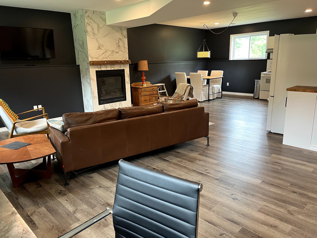 This unique place has a style all its own. Rock n roll decor tastefully done separate entrance to beautifully renovated basement apartment. Enjoy the comfort of heated floors . Lots of natural light. Full kitchen with cooking utensils. 3 piece bathroom with his and her sinks. Two bedrooms (queen). Playing cards , board games , books to read . Close to snowmobile trails and gas station !!! No Pets pls , No Smoking in building.