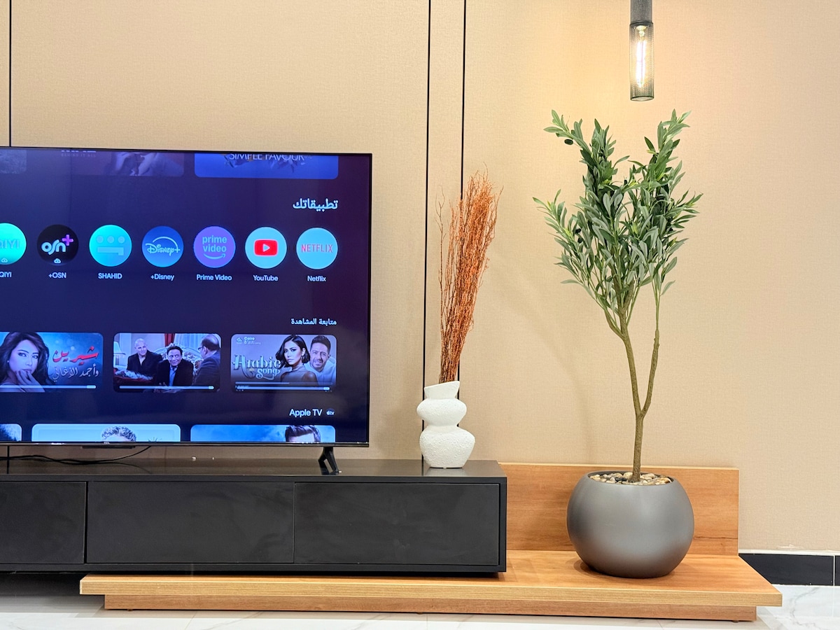 مرحبا بكم في شقتنا التي توفر لكم إقامة استثنائية تفوق توقعاتكم.الشقة تحتوي على غرفة نوم مجهزة بأجود أنواع المراتب بالإضافة الى صالة منفصلة بأرائك مريحة مع شاشة ذكية 65 بوصة للاستمتاع(نتفلكس, شاهد, بي ان)+واي فاي. المطبخ مجهز بكامل الأدوات لتلبية جميع احتياجاتك. تتوفر جلسة خارجية بتصميم ريفي واطلالة مميزة على المركز المالي مناسبة لإقامة المناسبات والجمعات مع الاهل والاصدقاء. الشقة مُجهزة للإقامات القصيرة والطويلة. الموقع رائع في قلب المدينة بالقرب من المعالم السياحية والخدمية والمطاعم.