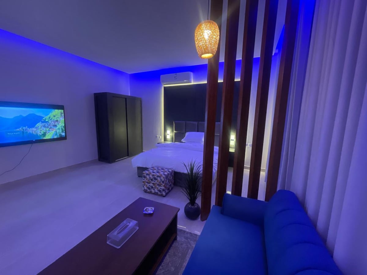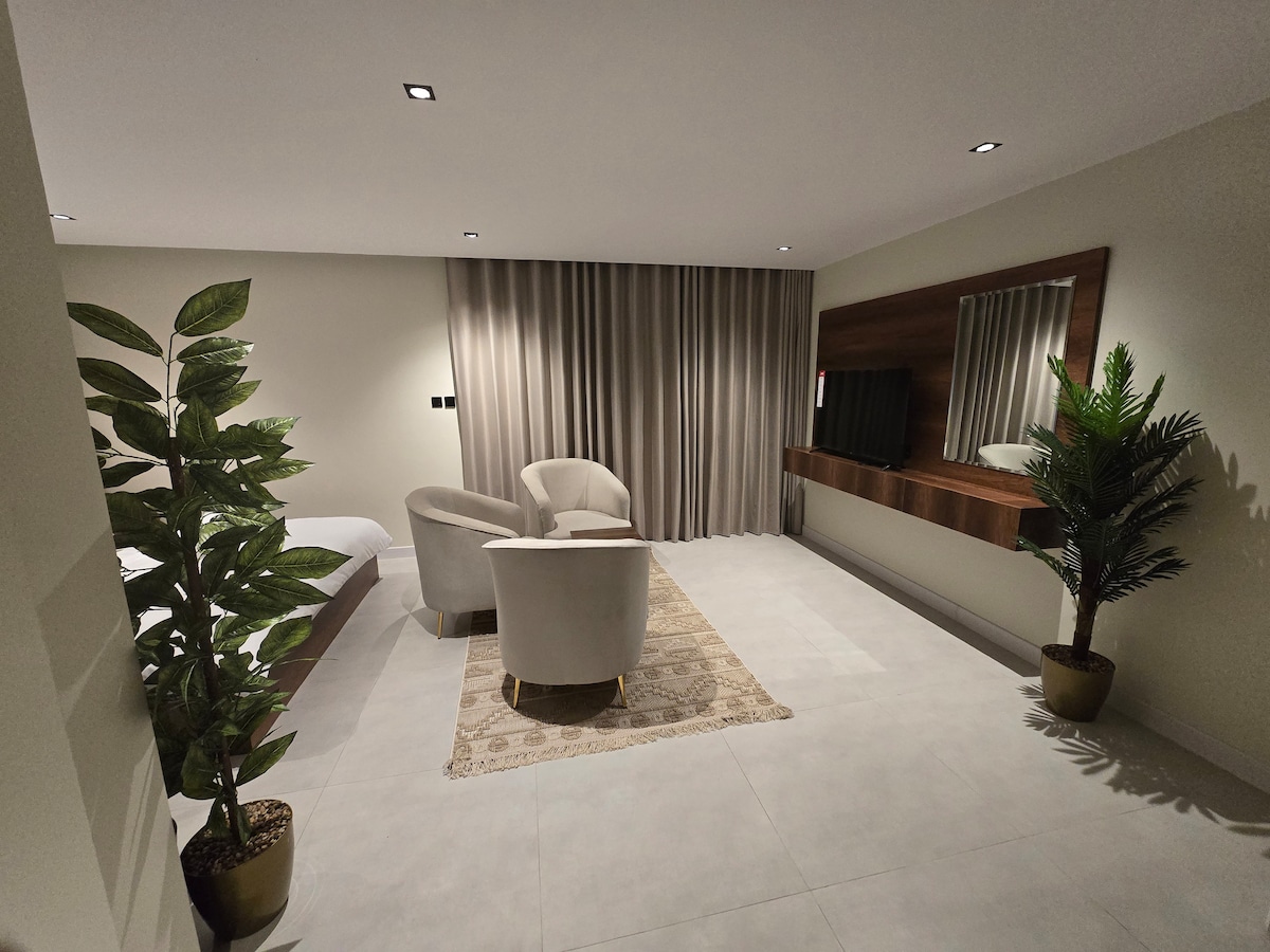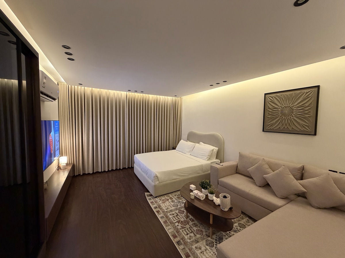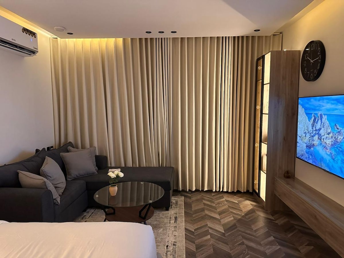 This unique place has a style all its own. New luxury hotel studio with an outdoor terrace. Modernly designed and elegantly colored, the studio has distinctive and clean entrances. It boasts a spacious and distinctive area, complete privacy, and smart entry. Located in the Al-Malaz (Al-Dhubat) district in the center of Riyadh, it boasts easy access to the city's main streets. It's also close to recreational facilities. We wish you a pleasant stay!
