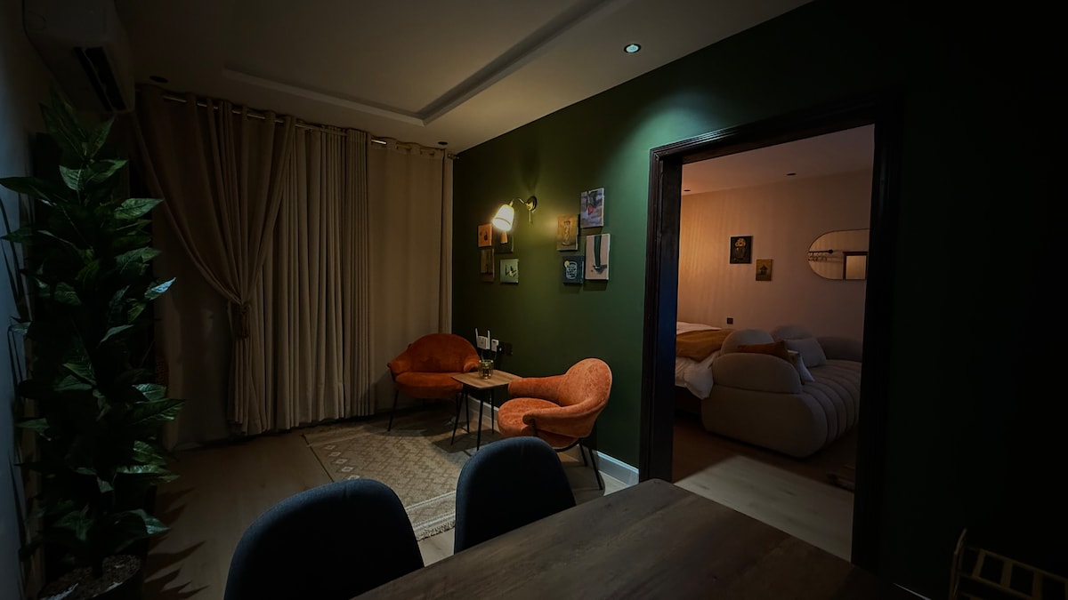 A vibrant and creative space with natural light and bohemian flair First Floor. This one-bedroom apartment features a sunlit bedroom with a street view and a living room with a sofa bed, allowing up to 4 guests to stay comfortably. مساحة فنية ومشرقة بإضاءة طبيعية وطابع بوهيمي دور أول بسلم مريح . تحتوي الشقة على غرفة نوم بإطلالة على الشارع، وصالة بأريكة قابلة للتحول إلى سرير لاستيعاب حتى 4 ضيوف. مثالية للأزواج، أو الأفراد، أو من يحبون الأجواء الفنية. ابدأ يومك بأشعة الشمس وأجواء تمنحك الإلهام.