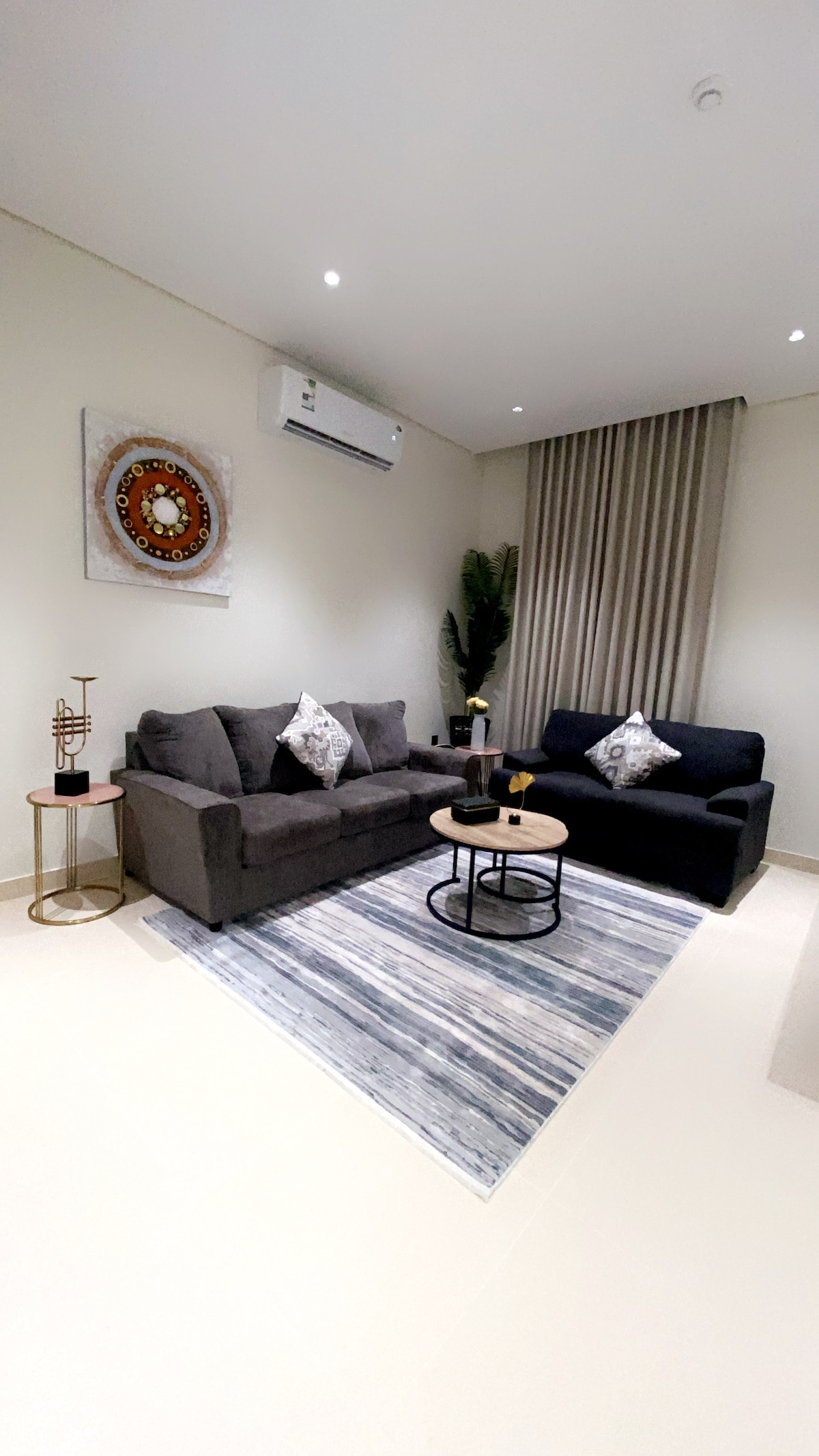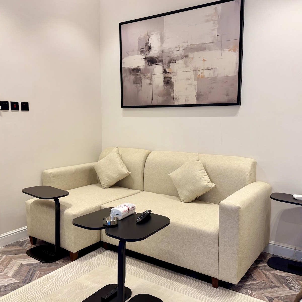 A cozy and stylish space with mid-century character. This one-bedroom apartment includes a king-size bed, a comfortable living room with a sofa bed (sleeps 2 additional guests), and warm vintage touches throughout. Located on the ground floor for easy access. شقة أرضية بطابع منتصف القرن | غرفة نوم بسرير كينغ + أريكة سرير شقة مريحة بطابع منتصف القرن الكلاسيكي. تضم غرفة نوم بسرير كينغ، وصالة بأريكة سرير تتسع لشخصين إضافيين، مع ديكورات دافئة وكلاسيكية. تقع في الطابق الأرضي لسهولة الوصول