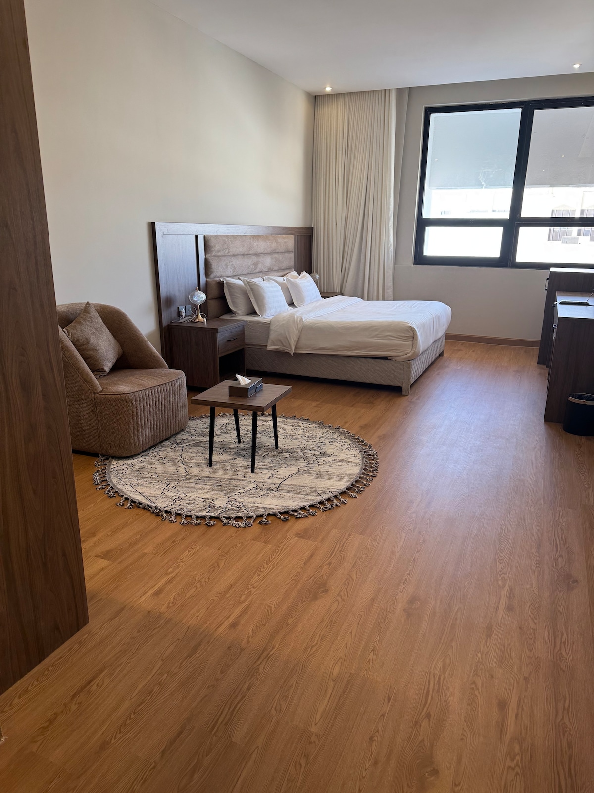 Enjoy a modern stay in Riyadh’s Olaya. This stylish apartment features a private balcony with outdoor seating, a cozy bedroom with smart separation, a comfortable living area, fully equipped kitchenette, in-unit washing machine, and workspace. Just an 8-minute walk to the metro, with Al Jazirah Hypermarket right across the street. The area is vibrant and full of restaurants and cafés—perfect for food lovers and business or leisure stays.
