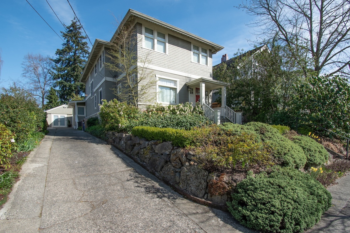 Quiet and clean 290 sq. ft. detached private studio on top of Queen Anne hill, set among historic homes just one short block to "Main St." While many local Airbnbs are in noisy basement spaces with limited daylight/ceiling height, our studio with a private patio and free parking, is in a separate peaceful building. Walk score is 94 w/ over 40 shops just steps away. Smoke, Pet-Free. A few blocks from #2, 3, 4, 13 buses. Close to Downtown, Seattle Center, Fremont, Gates Foundation, Amazon,