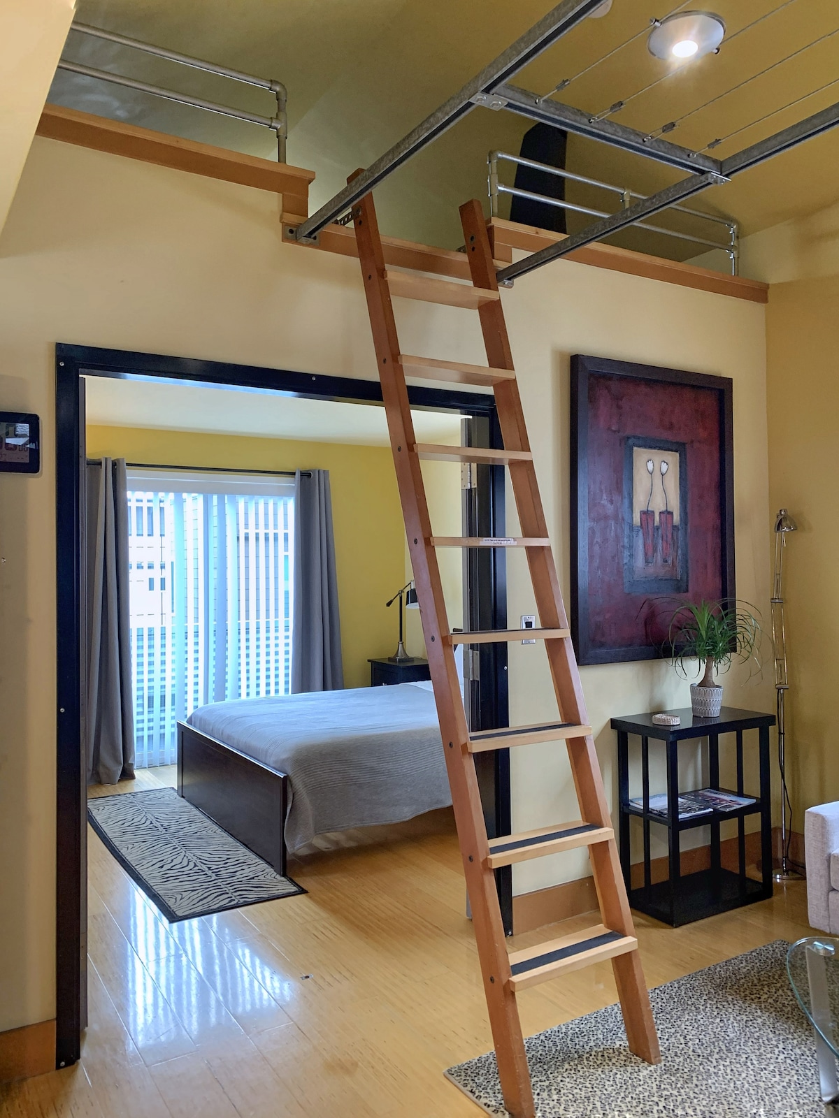 The Urban Loft: 16ft Ceilings, ADA Accessible & Ballard-Bound Transit Welcome to your light-filled, loft-like sanctuary featuring dramatic 16-foot ceilings and walls of windows with privacy screens. At 525 square feet, this unit feels incredibly airy, open, and comfortable—it’s the ideal base for your Seattle adventures. It is on a busy street and there's an Airbnb upstairs so if you're sensitive to noise please be aware. No checkout chores!