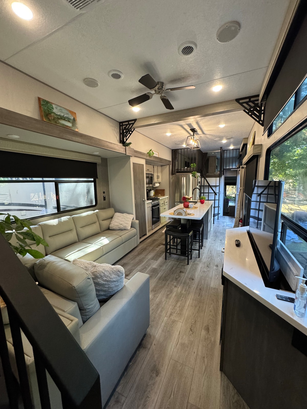 35 ft. Fleetwood has all the amenities. Kitchen, refrigerator and freezer, dining table, bathroom, master bedroom and convertible couch. Close to the airport, close to downtown, very quiet neighborhood with no traffic going by. Private yard with deck, propane BBQ, fire pit and hot tub included. If you like a lush garden setting this is for you.