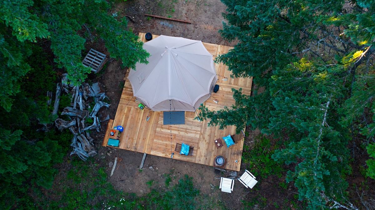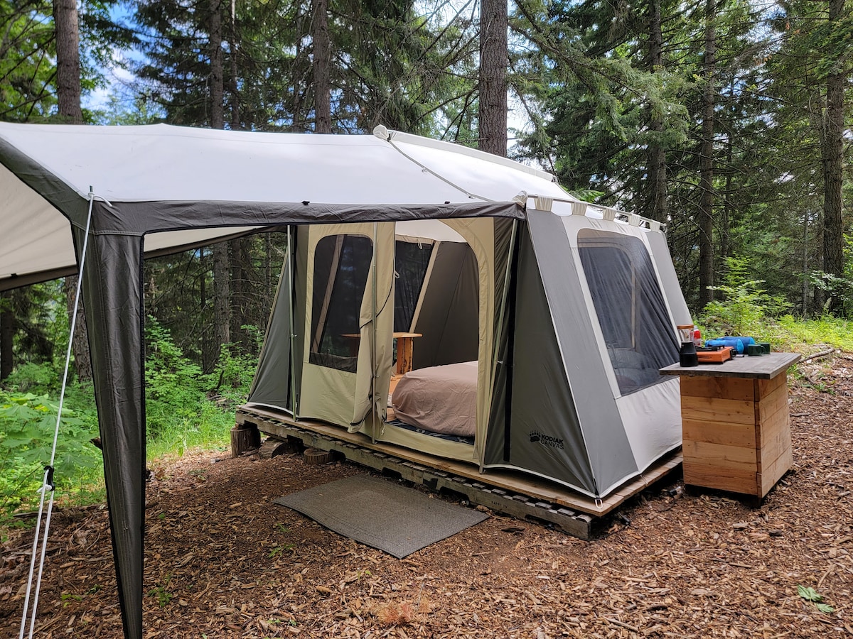 Site access requires AWD/4WD. Immerse yourself in nature and all it’s benefits in Cle Elum, just 90 minutes from Seattle and 30 min from Cle Elum Lake Glamping is like camping, except you don’t have to buy the gear, load it, set it up or take it down. You will stay in a 12' x 14' white duck canvas wall tent on a 256sqft deck with 2 inflatable queen beds w/lines and a separate private 64 sqft deck with fire pit, table, hot water station and 2 chairs.